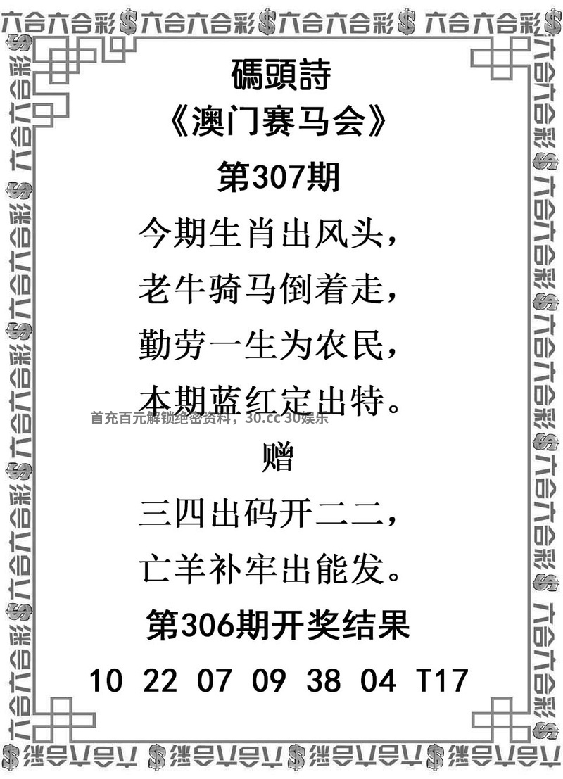 | 308期:澳门葡京/助理玄机诗/特码王中王/地下绝密料 |